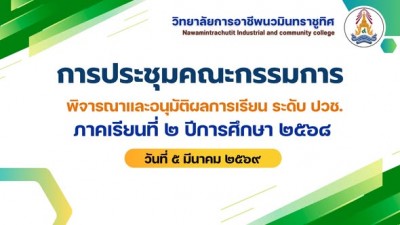 เมื่อวันที่ 5 มีนาคม 2569 วิทยาลัยการอาชีพนวมินทราชูทิศ จัดการประชุมคณะกรรมการพิจารณาและอนุมัติผลการเรียน ระดับประกาศนียบัตรวิชาชีพ (ปวช.) ภาคเรียนที่ 2 ปีการศึกษา 2568 ณ ห้องประชุมของวิทยาลัยฯ โดยมี นายสุนทร สงพราหมณ์ ผู้อำนวยการวิทยาลัยการอาชีพนวมินทราชูทิศ เป็นประธานในการประชุม พร้อมด้วยนายธานี กิมทรง รองผู้อำนวยการฝ่ายวิชาการและคณะครูที่เกี่ยวข้องเข้าร่วมการประชุมอย่างพร้อมเพรียง การประชุมครั้งนี้จัดขึ้นเพื่อร่วมกันพิจารณา ตรวจสอบ และอนุมัติผลการเรียนของนักเรียนระดับ ปวช. ให้เป็นไปตามระเบียบและหลักเกณฑ์ของสถานศึกษา ตลอดจนเพื่อให้การดำเนินงานด้านวิชาการเป็นไปด้วยความเรียบร้อย โปร่งใสและมีมาตรฐานทั้งนี้ การประชุมดังกล่าวนับเป็นส่วนสำคัญในการกำกับติดตามคุณภาพทางการศึกษาและส่งเสริมให้การบริหารจัดการด้านวิชาการของวิทยาลัยเกิดประสิทธิภาพสูงสุดเพื่อประโยชน์ต่อผู้เรียนและการพัฒนาการศึกษาด้านอาชีวศึกษาอย่างต่อเนื่อง.